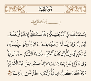«يَسْتَفْتُونَكَ قُلِ اللَّهُ يُفْتِيكُمْ فِي الْكَلَالَةِ إِنِ امْرُؤٌ هَلَكَ لَيْسَ لَهُ وَلَدٌ وَلَهُ أُخْتٌ فَلَهَا نِصْفُ مَا تَرَكَ وَهُوَ يَرِثُهَا إِنْ لَمْ يَكُنْ لَهَا وَلَدٌ فَإِنْ كَانَتَا اثْنَتَيْنِ فَلَهُمَا الثُّلُثَانِ مِمَّا تَرَكَ وَإِنْ كَانُوا إِخْوَةً رِجَالًا وَنِسَاءً فَلِلذَّكَرِ مِثْلُ حَظِّ الْأُنْثَيَيْنِ يُبَيِّنُ اللَّهُ لَكُمْ أَنْ تَضِلُّوا وَاللَّهُ بِكُلِّ شَيْءٍ عَلِيمٌ»