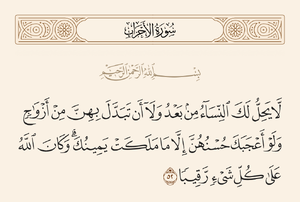 ﴿لَا يَحِلُّ لَكَ النِّسَاءُ مِن بَعْدُ وَلَا أَنْ تَبَدَّلَ بِهِنَّ مِنْ أَزْوَاجٍ وَلَوْ أَعْجَبَكَ حُسْنُهُنَّ إِلَّا مَا مَلَكَتْ يَمِينُكَ وَكَانَ اللَّهُ عَلَى كُلِّ شَيْءٍ رَقِيبًا﴾